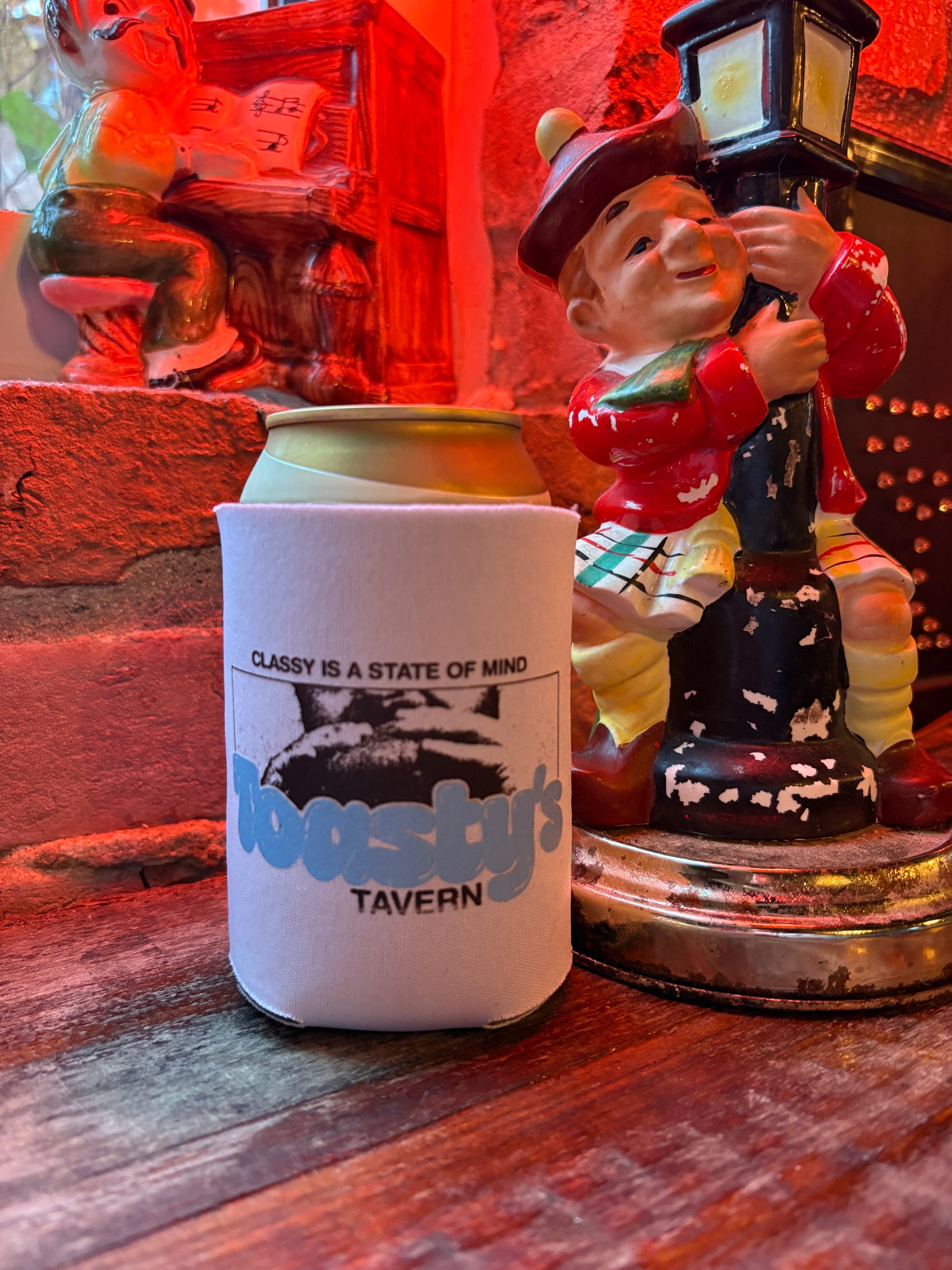 white koozie with blue bubble Toasty's logo and classy is a state of mind in print, burger face in black and white image. Fits standard sized aluminum cans.